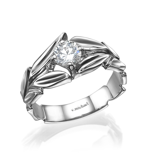 טבעת אירוסין זהב לבן 14k, יהלום מרכזי יפיפה משובץ על 4 שניים המעוטר משני צידיו בעלים מעוצבים בטקסטורה מיוחדת המשלים את המראה הייחודי של הטבעת ,טבעת זו היא חלק מקולקציה שלנו לעיצובי עלים. רשום באתרינו בחיפוש: עלים ותוכלו להתרשם מטבעות נוספות בדגמי עלים .