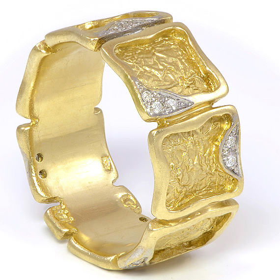 טבעת מעוצבת רבועי זהב צהוב 14K עם טקסטורה מריחות ייחודית כשבקצה כל לוח שיבוץ יהלומים קטנים .טבעת עשויה עבודת יד ברמת גימור איכותית וגבוהה.